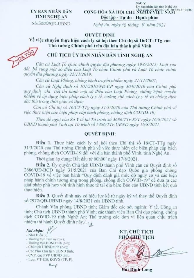Quyết định về việc chuyển cách ly xã hội theo Chỉ thị số 16/TTg của Thủ tướng Chính phủ trên địa bàn thành phố Vinh