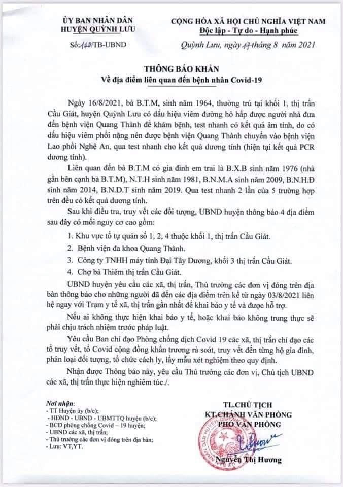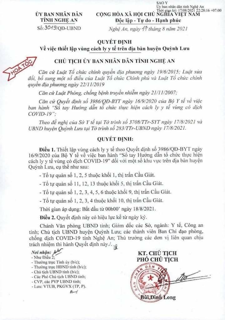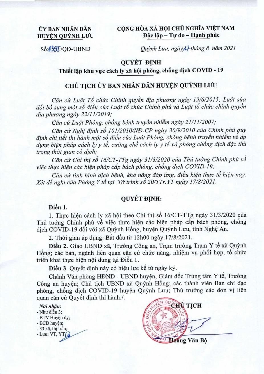 Quyết định về việc thiết lập vùng cách ly y tế trên địa bàn huyện Quỳnh Lưu